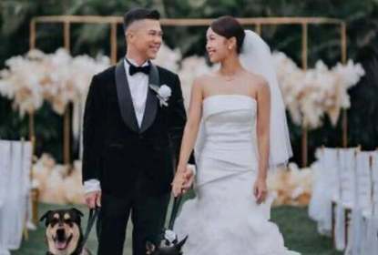 黄心颖深夜晒出婚礼照,小两口身穿西式婚服,各自牵着爱犬接受亲...