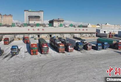 在新疆霍尔果斯口岸金亿货场内,一车车满载果蔬的车辆有序排...
