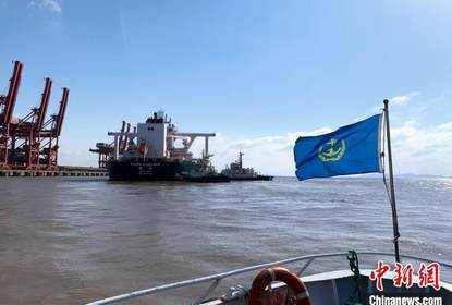 在海事部门的护航下,中国香港籍40万吨散货船“明卓”轮顺利靠...