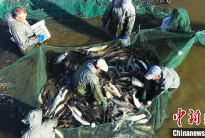 进入11月以来,新疆昌吉回族自治州玛纳斯县境内池塘养殖的鱼...