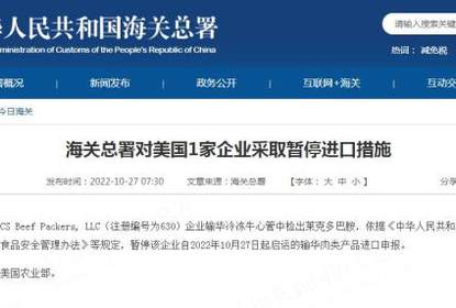海关部门从美国CSBeefPackers,LLC(注册编号为630)企业输华冷冻牛...