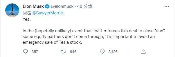 特斯拉CEO马斯克10日在推特回应“你是否完成出售特斯拉股票”的提...
