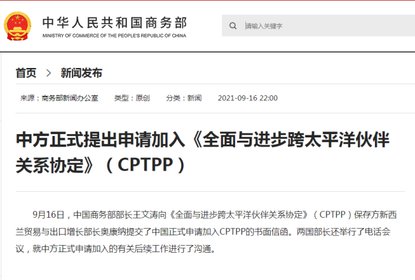 中国商务部部长王文涛向《全面与进步跨太平洋伙伴关系协定》(CP