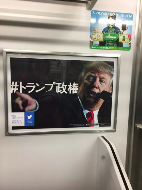 从3月下旬开始,一系列描绘有特朗普形象的商业广告引人注目地出现在东京的地铁车厢和地铁站。Twitter公司日本发言人给国外科技媒体TechCrunch的解释是,特朗普广告是一项新品牌活动的一部分,活动的正式开始日期是3月20日,为期两周,宣传口号是“现在你不知道的事”,届时将有大约数以百万计的tweets实时滚动展示。