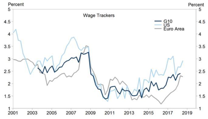 与此同时,发达经济体的工资增长继续显著回升。分析表明,应该把美国和英国的工资上涨看作是对物价通胀数据的交叉检验,从而证实通胀压力接近目标。但发现,工资增长通常导致欧洲物价上涨,这表明核心通胀最终将回升,尽管可能需要一段时间。