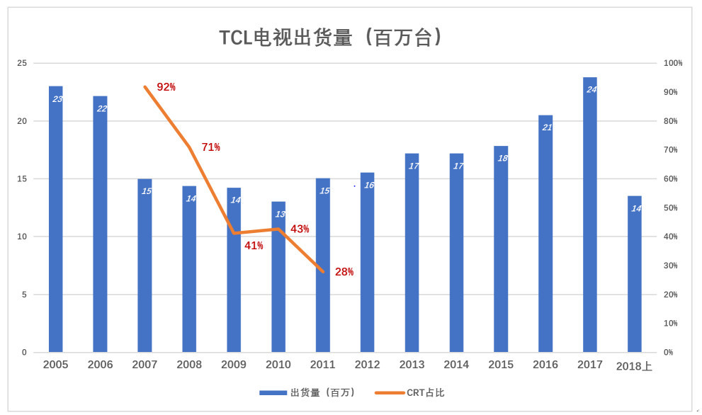 2006-2012年这五六年间,彩电行业经历了从CRT(显像管电视)到平板电视的革命。TCL的产品结构发生了翻天覆地的变化,CRT占比从100%跌到71%(2008年)、再到28%(2011年)。从2012年开始,TCL不再披露CRT的出货量,估计其产品已经完全平板化了。2018年上半年,TCL液晶电视销量1351万台,其中海外市场销量828万台、占比61.3%。