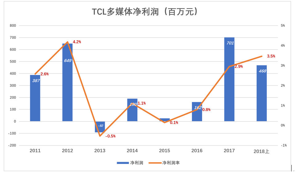 TCL多媒体业务滞涨是不争的事实。2005年该板块收入336亿,占总营收的63%。2007年收入跌至207亿,占营收的53%。又过了十年,2017年TCL多媒体业务收入不过353亿,较2005年增长5%,折合年均增长0.4%!