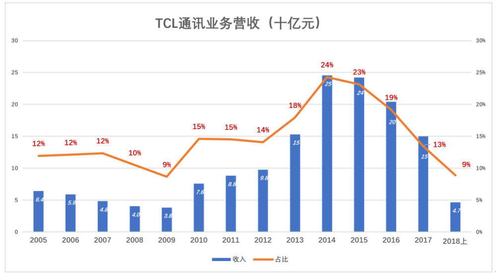 但在华为、小米等品牌高歌猛进之时,TCL节节败退。2015-2017年连年负增长。2017年,TCL通讯收入跌破150亿、占营收的13%;2018年上半年收入46.6亿,同比下降32.1%,只占营收的9%。李东生在2016年报中说“逆水行舟,不进则退”,TCL通讯哪里是逆水行舟,分别是顺流而下!
