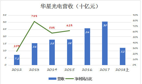 TCL投资的8.5代液晶面板项目于2011年10月开始量产,陆续产出28吋、32吋、37吋、46吋、55吋、110吋液晶面板和模组。在为TCL多媒体之外亦为国内外整机厂提供配套,2012年营收72.4亿,净利润3.15亿。2013年、2014年,华星光电销售收入分别为155.3亿和179.6亿,净利润分别为22.6亿和24.3亿。TCL集团效益从此大为改观,2013年华星光电净利润相当于集团净利润的78%,2015年时相当于62%。