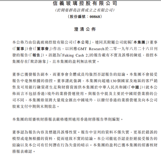 上月才狙击李嘉诚旗下长和(77.95, 0.80, 1.04%)(00001-HK)的独立会计研究机构GMT Research昨日发表报告,狙击內地玻璃生产商信义玻璃(8.38, 0.14, 1.70%)(00868-HK),质疑信玻的派息资金来源。信义玻璃昨晚发布澄清公告表示:董事认为报告内容及标题具误导性质。报告中呈列的资料不仅失实,更基于错误的模型或毫无根据的资料,从而达致不实的结论。本公司彻底否认并拒绝接受报告的结论以及本公司有任何潜在行为失当的暗示。