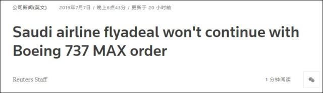 据路透社7日消息,在去年10月和今年3月波音737 MAX飞机连续两次发生致命坠机事故后,Flyadeal今年4月已表示,将考虑取消30架波音737 MAX的订单。