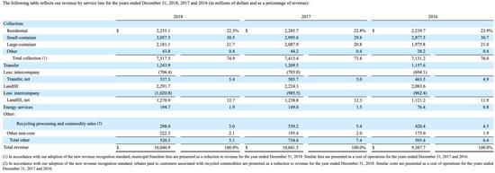 从WM2018年的年报可以看出,其收集业务占营收大部分,商业和工业领域的收集营收比重也较大。