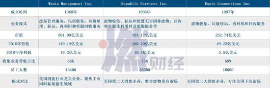 但在美国垃圾管理公司中,早已诞生三家百亿美元级别的上市公司,截至2019年7月19日(下文同),三家公司市值加起来超过千亿美元。它们分别是Waste Management Inc.(美国废物管理公司(116.79, -1.18,-1.00%),WM.US)、Republic Services Inc.(共和服务公司(87.11,-0.93, -1.06%),RSG.US)、Waste Connections Inc.(废物联合公司,WCN.US),均已成立多年,这三家公司的垃圾前端收集业务占比接近70%。