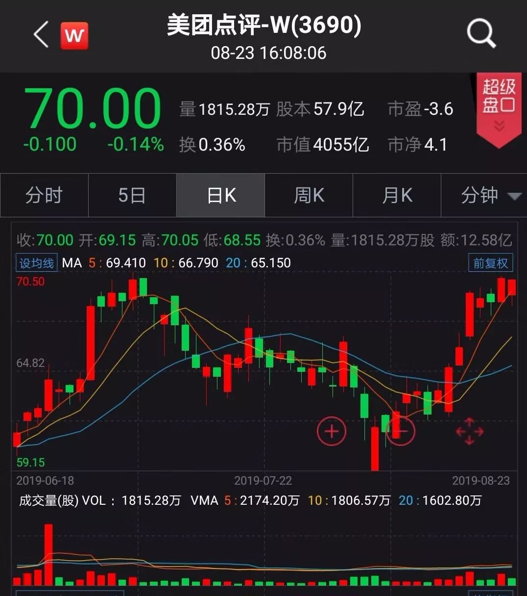 业绩超预期,股价近日也持续回升。截至8月23日,美团已重回上市发行价(69港元/股)上方,市值站上了4000亿港元。