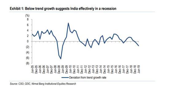 Nirmal Bang的经济学家Teresa John周二发表的一份报告称,“经济增长已经连续两个季度低于6.6%的长期趋势,这意味着印度实际上处于准衰退状态。”她补充说,早期指标表明,进一步提振经济增速仍然难以达到。