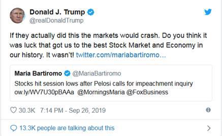据今日俄罗斯(RT)报道称,美国众议院24日宣布正式启动对特朗普的弹劾调查,当地时间26日,特朗普在推特(42.44, -0.06, -0.14%)上发文警告:“如果他们真的这么做了,市场就会崩盘。你们认为我们拥有历史上最好的股市和经济是因为运气好吗?它不是!”