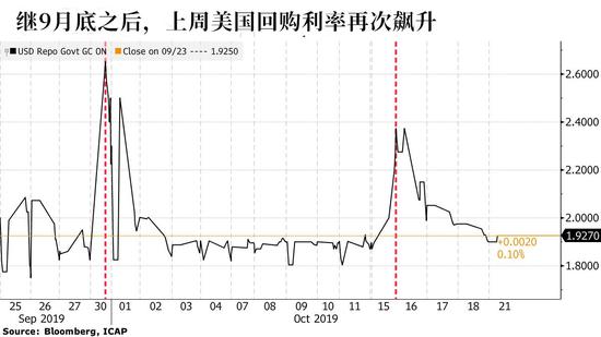 9月下旬,美国回购利率飙升,美联储向金融体系注入了大量的资金,并开始每月购买至多600亿美元的美国国库券,以缓解庞大的回购市场压力。然而,在美联储投放了大量资金后,美国货币市场流动性紧缺的问题似乎并没有彻底解决。上周,美国回购利率又飙升了。