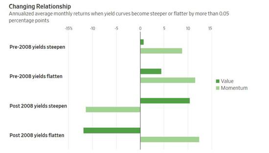 近年来,一种更为明显的关系推动了这种转变:当收益率曲线变得更陡时,也就是长期和短期政府债券收益率之间的差距会扩大时,价值型股票的表现会更好,这种10年前不存在的相关性如今变得更加明显,尤其是自2016年以来。