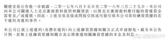 2018年3月29日,汇源果汁发布公告称,公司于2017年8月15日至2018年3月29日期间,向北京汇源饮料提供短期贷款,以便北京汇源饮料应付临时营运资金需要及还债。