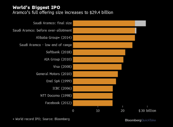 根据公告,作为全球最大IPO的承销商之一,高盛(242.11, -0.49,-0.20%)行使了超额配售权,从而将沙特阿美发行规模提高至294亿美元。该公司表示在簿记建档过程中,以每股32里亚尔(合8.53美元)的价格,向投资者额外配售了4.5亿股新股。
