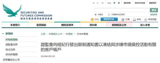 香港证监会于昨 公布,向某中资券商发出限制通知书,禁止该券商处置其6个客户账户内共计价值1.7亿港元资产,因涉及去年11月至12月初,涉嫌操控Hon Corporation Limited (08259.HK)股价。证监会续指,调查仍在进行中。