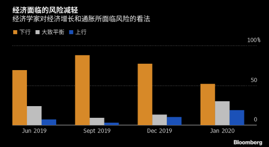 经济学家明确表示,他们认为美国经济比去年更稳固,这可能是由于贸易紧张局势缓和以及脱欧不确定性有了明显的解决方案。接受调查的经济学家中,表示通胀和增长面临下行风险的受访者比例从12月的77%下降至52%。此外,经济学家的中值预期是,美联储被迫在2020年将利率降至零(一种衰退情境)的可能性从20%降至15%。