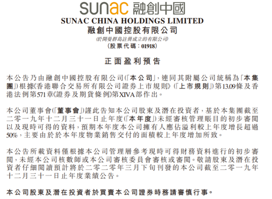 融创中国(41.2, -0.45, -1.08%):预期本年度本公司拥有人应占溢利较上年度增长超过50%,主要由于于本年度物业销售交付的面积较上年度增加所致。