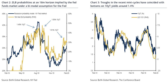 美国银行的数据显示,最近的迷你周期低谷与10年期收益率约1.4%的底部同时出现。若10年期美债突破这个“临界点”需要美联储具有超过50%的可能性将利率降回0%!这意味着,如果在美联储暂停利率变动的情况下突破1.4%,会造成显著的美债倒挂,进一步推升衰退的可能性。