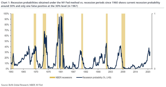 尽管30%的衰退可能性仍然会出现误差,但一旦纽约FEDs的指标达到40%的水平,历史表明经济衰退即将到来。
