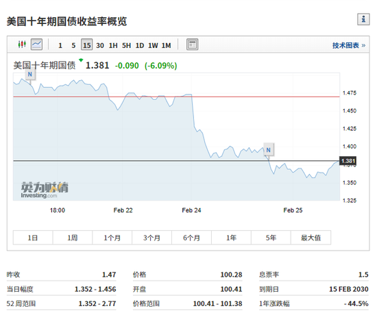 当前,10年期美债收益率为1.381%,距2016年7月份的1.3579%的历史低点不足3个基点。