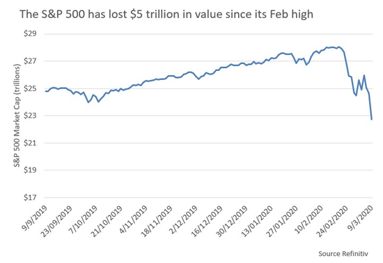 疫情在全球蔓延及其对经济的影响的随着油价的暴跌而加深,近几周来,标准普尔500指数已经蒸发近5万亿美元。