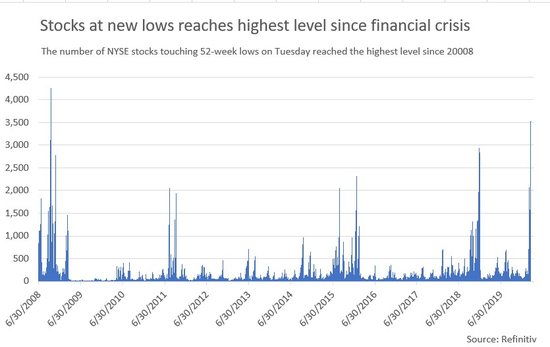 周一,纽交所触及52周低点的股票数量达到逾3500只,创下2008年以来的最大。