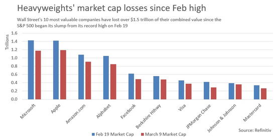 自从标准普尔500指数创历史新高以来,该指数已经损失了超过5万亿美元的价值。标准普尔500指数中市值最大的10家公司的总市值下降了1.4万亿美元以上。