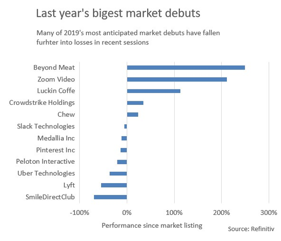 美股暴跌也影响了那些去年在华尔街上市时备受期待的公司的股价,包括Peloton Interactive 和Uber Technologies 在内的公司蒙受了更大的损失,而包括Beyond Meat 在内的投资者青睐的公司的收益也受到了影响。
