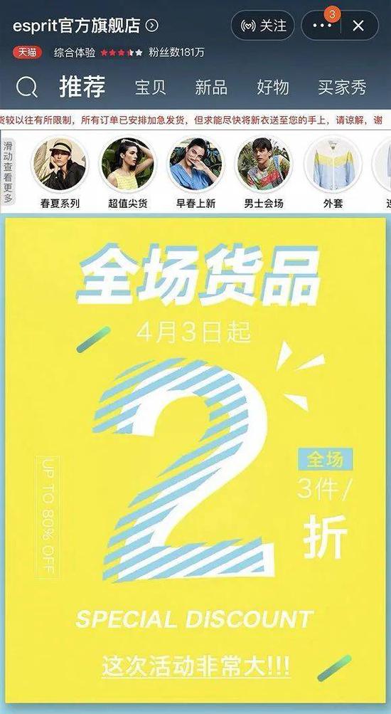 根据ESPRIT天猫旗舰店,从4月3日开始,品牌全场货品3件2折。ESPRIT官方微信公众号则连续多日发布推送,称ESPRIT门店全场2折。
