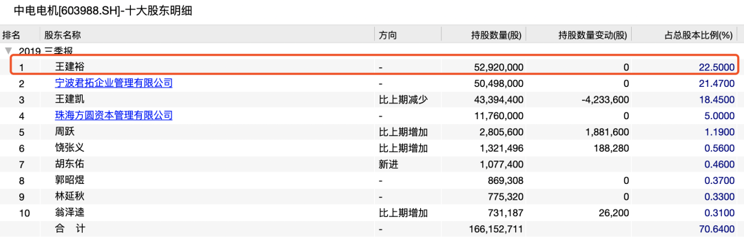 2019年1月,王建裕宣布辞去公司董事长职务。目前王建裕仍为中电电机法定代表人,并继续担任总经理一职。截至2019年三季度末,王建裕仍持有中电电机22.5%股份。