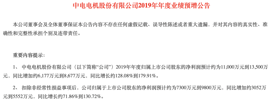 值得一提的是,新股东入驻后的中电电机业绩持续向好。今年1月17日晚间披露的公告显示,公司预计2019年实现的净利润约为1.1亿元到1.35亿元,同比增长约128.08%到179.91%。公司2019年度业绩增长,主要因受市场影响,行业需求增大,公司主营业务大幅增长。
