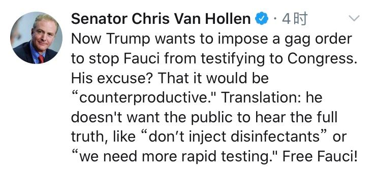 美国参议员克里斯(Chris Van Hollen)也在个人社交媒体平台上发文表示,特朗普政府是想给福奇强制下言论禁止令,阻止他在国会上作证,以此掩盖真相。克里斯表示,所谓的“适得其反”其实只是特朗普的借口!