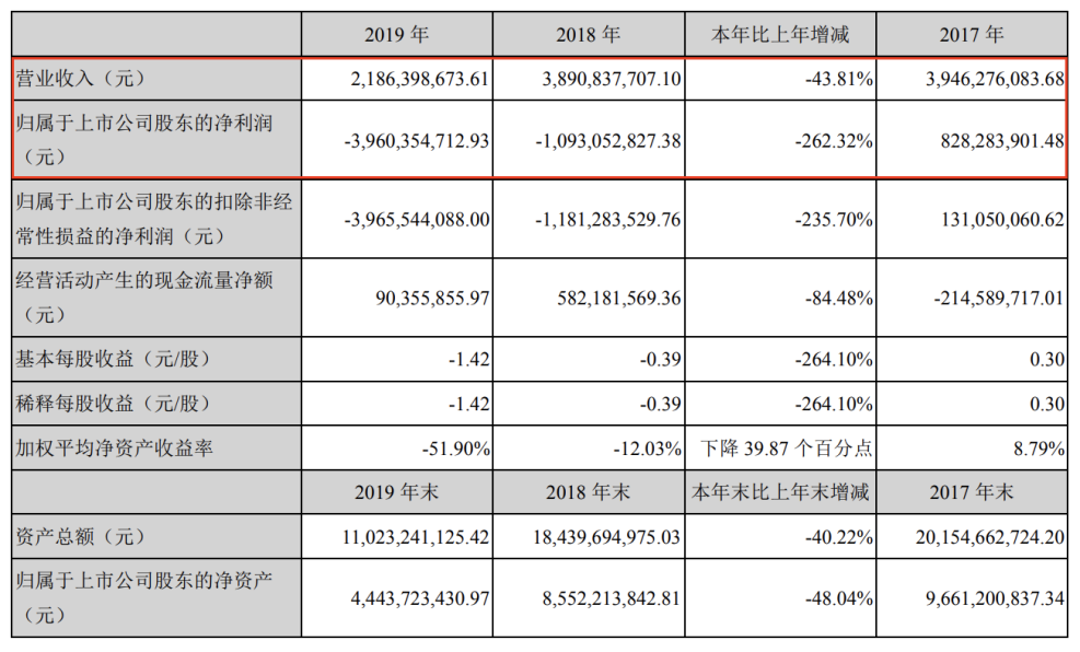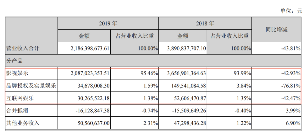 年报显示,2019年,华谊兄弟实现营收21.86亿元,同比减少43.81%;净亏损39.6亿元,同比2018年亏损10.93亿元,减少262.32%。