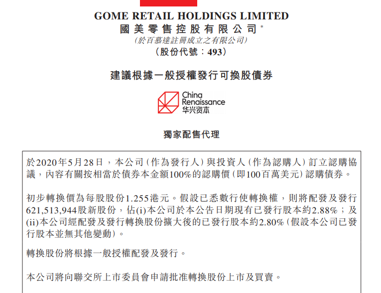 该可换股债券初步转换价为每股1.255港元。假设已悉数行使转换权,则将发行约6.2亿股新股份,占公司于公告日期现有已发行股本约2.88%;及公司扩大后的已发行股本约2.80%(假设公司已发行股本并无其他变动)。