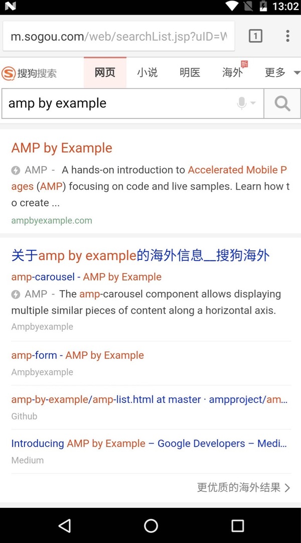 近年来,在人工智能驱动下,搜狗搜索实现了技术与内容的差异化,成为改变中国搜索市场格局的唯一挑战者。搜狗搜索通过众多差异化产品,精准地虏获了中国当下年轻人的求知欲和好奇心。其中,搜狗海外搜索网罗全球英文资讯,并独创跨语言搜索功能,让不懂英文的年轻人搜索并阅读全球的英文资讯和内容,成为读懂世界的“窗口”。而搜狗搜索参与AMP开源计划,将为对海外资讯有需求的搜索用户带来直接利好,用户可在瞬间打开带有AMP标识的英文网页,快速获得和阅读全球资讯。
