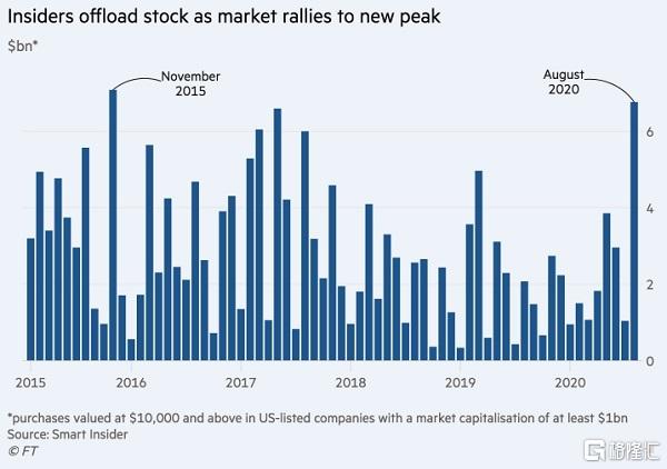 根据数据提供商Smart Insider为英国《金融时报》汇编的数据,1042位美国企业的首席执行官、首席财务官和公司董事在8月份出售了67亿美元自家公司股票,抛售规模超过2015年11月以来的任何一个月,人数则创2018年8月以来最多。这些交易表明,企业内部人士将美股自3月低点以来的历史性反弹变现。