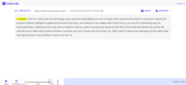 但SwiftScribe的功能目前还没有很完善,在转录成功后,用户还需自行对文本进行编辑。SwiftScribe转录出来的文本是不带标点符号的,用户需要自行断句、并对可能出现的错误进行更正、以及编辑英文单词大小写等。不过SwiftScribe同样提供变速阅读工具,让用户在校对编辑时可以调慢播放速度。