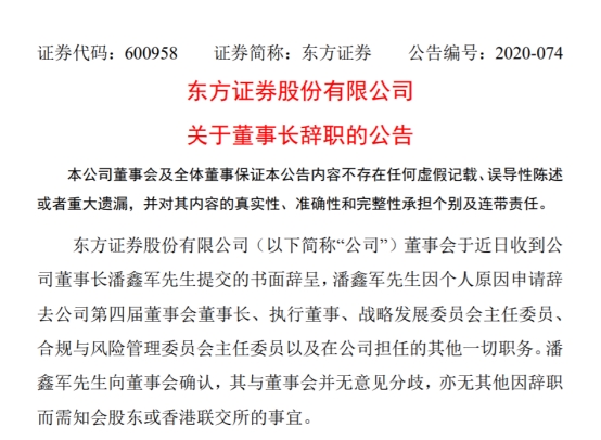 10月16日,东方证券公告,潘鑫军因个人原因申请辞去公司第四届董事会董事长、执行董事、战略发展委员会主任委员、合规与风险管理委员会主任委员以及在公司担任的其他一切职务。