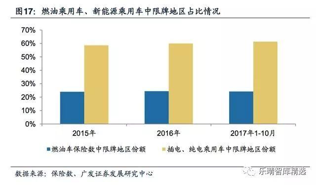 根据交强险数据,15年、16年及17年1-10月份,我国限牌地区燃油乘用车保险数占国内燃油车总保险数的比值分别为24.0%、24.5%、24.2%,而限牌地区新能源乘用车保险数占比分别达到58.7%、60.0%、61.4%。