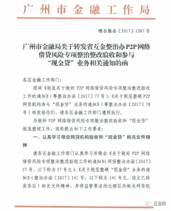 12月25日,互金咖从接近监管的权威人士处获悉,广州市金融局当天正式下发《关于转发省互金整治办P2P网络借贷风险专项整治整改验收和参与“现金贷”业务相关通知的函》(以下简称《验收函》)。