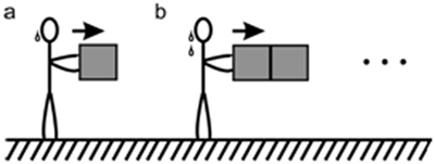 图一,推动物体的难度正比于物体的惯性,惯性的大小用质量表征。(a)推动一块积木可能需要消费一滴“汗”;(b)推动两块块积木可能需要消费两滴“汗”。飞船中的积木处于失重状态,船员通过魔术胶带使自己的双脚粘在飞船的底部。