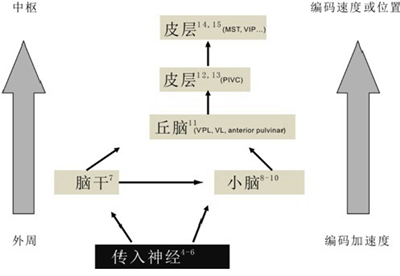 如同企业者号的船员无法区分静止和匀速运动,前庭器官面对这个问题同样束手无策。但我们在日常生活中却很少有这样的困惑,诚然一系列的研究表明,随着惯性运动信息从外周到中枢上行,前庭系统通过整合来自耳石器官和半规管的信息逐渐倾向于编码惯性运动的速度和位置信息(图十)。除了整合前庭系统内的信息,前庭中枢也可以整合来自视觉等其他模态的信息帮助动物精准地判断自身惯性运动信息。