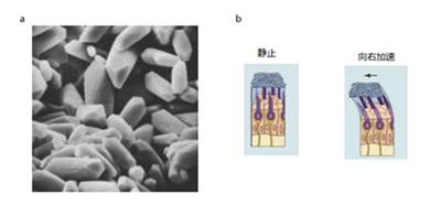 图八,耳石器官传导线加速度。(a)猫的椭圆囊中的碳酸钙晶体的扫描电镜图。每个晶体约50um。(b)线性加速运动将引起毛细胞偏折向加速度的方向。改编自PURVES, D., et al. (2004)2。