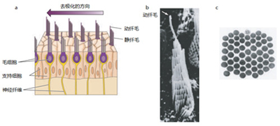 图六,毛细胞的解剖结构。(a)前庭器官的一个切面,在这个切面中所有毛细胞的动纤毛都在同一侧。(b)豚鼠前庭毛细胞的纤毛束的结构。从当前视角可以看到在从静纤毛到动纤毛(箭头所指)的过程中,纤毛的长度逐渐变长。(c)纤毛束的横切面。改编自PURVES, D., et al. (2004)2。